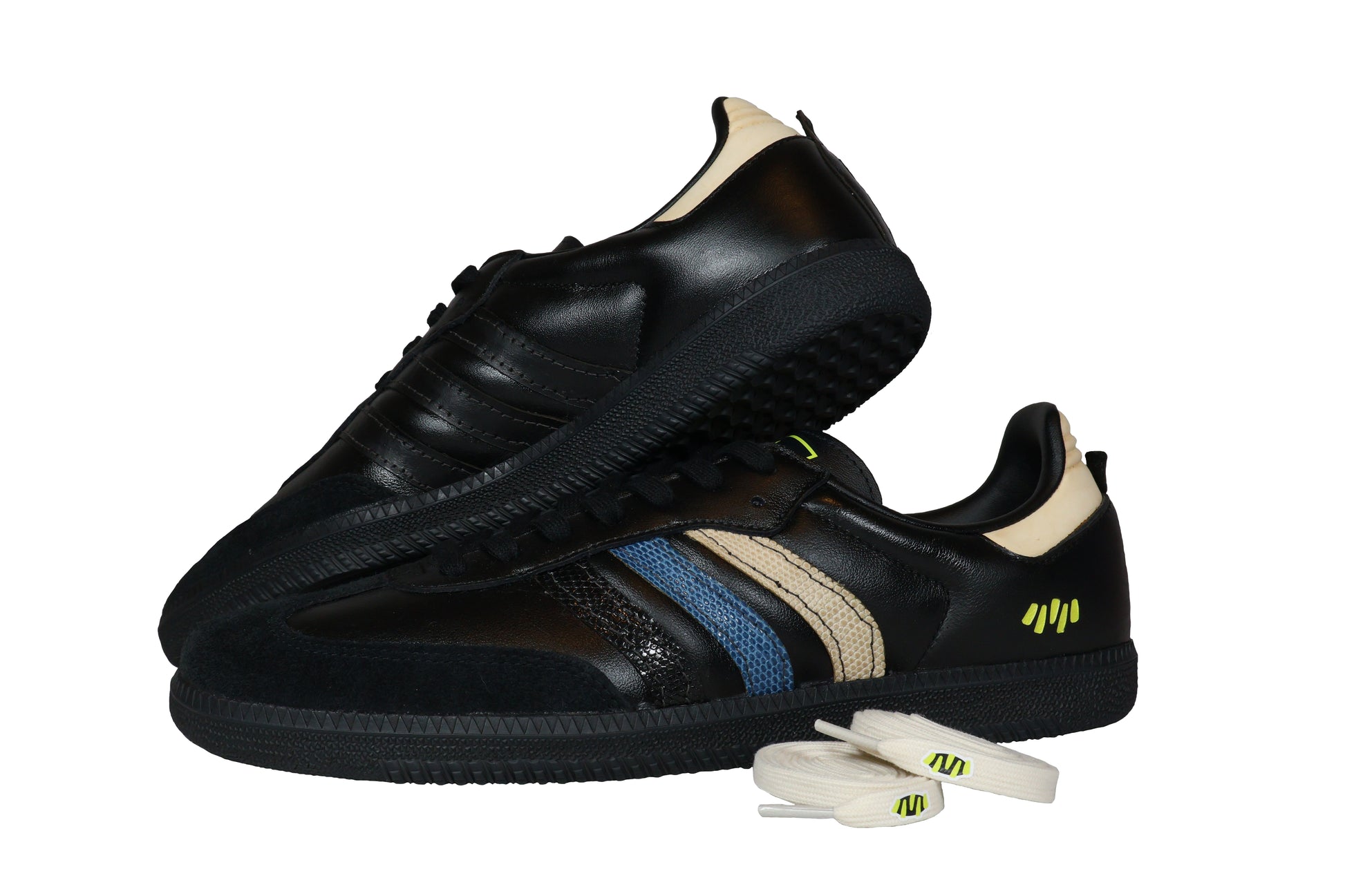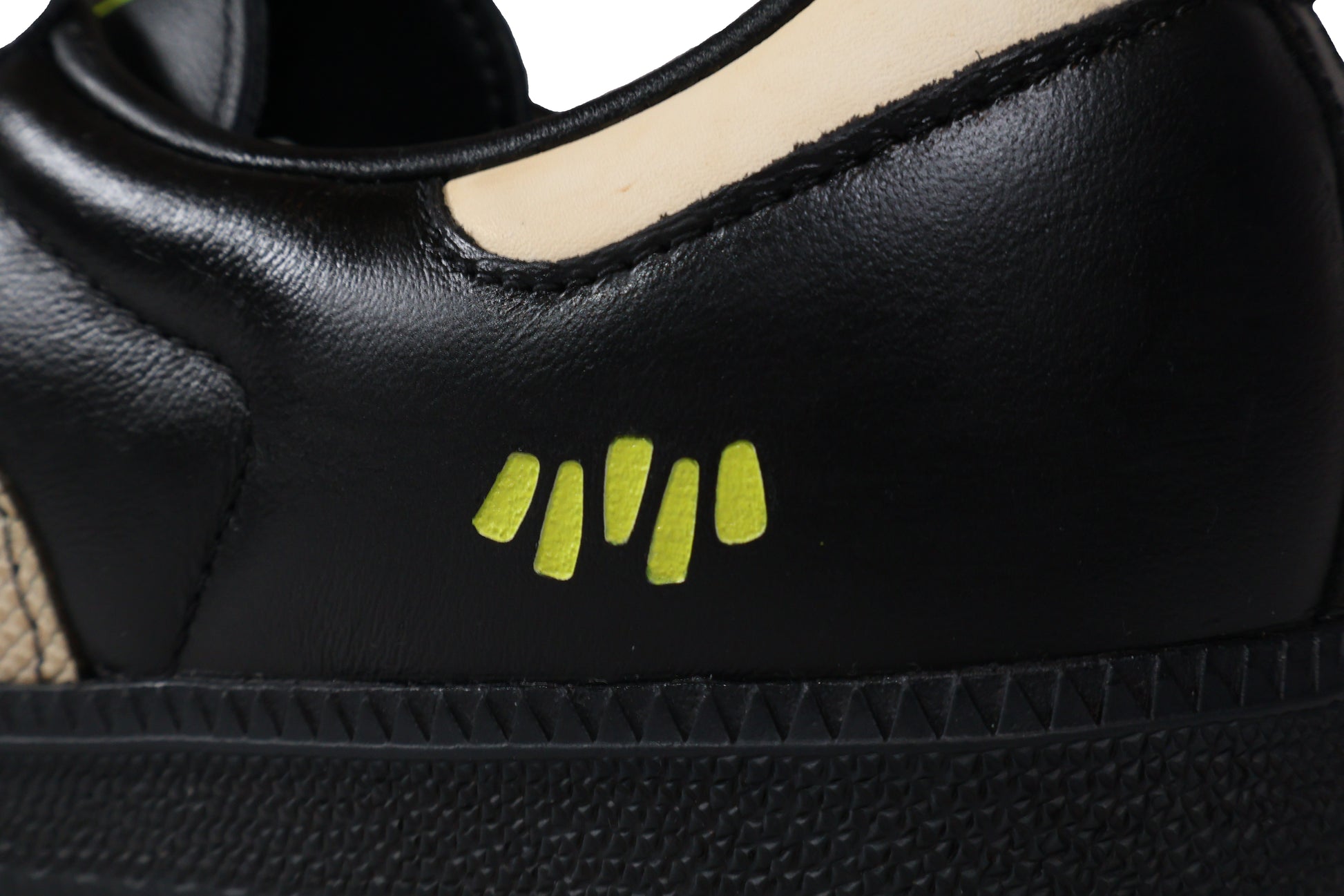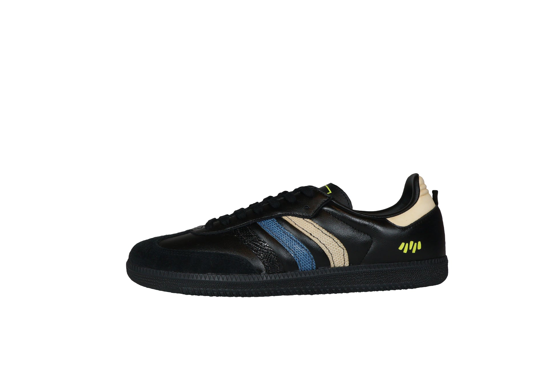 PROJ 1 IS MADE OF CURVILINEAR STRIPES REPLACING THE TRADITIONAL 3 STRIPES. THE INTENSITY OF THE CURVE INCREASES AROUND THE SHOE. THE LATERAL SIDE STRIPES ARE MADE WITH BLACK / BLUE / BEIGE IGUANA. THE MEDIAL SIDE STRIPES ARE MADE WITH BLACK ITALIAN LEATHER.